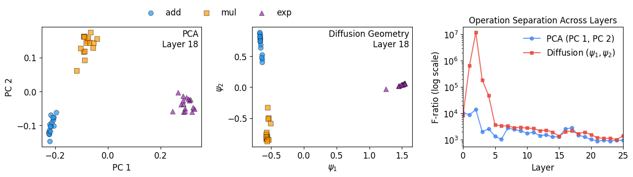 The figure shows the results for layer 20 of Gemma 2 2B. In the PCA projection, the three operations are separated, but the clusters are diffuse and partially overlapping. There is substantial internal spread, which mixes both operand variation and operation identity. Diffusion geometry produces a much cleaner picture, where the three operations form well-separated clusters in a tripod structure.