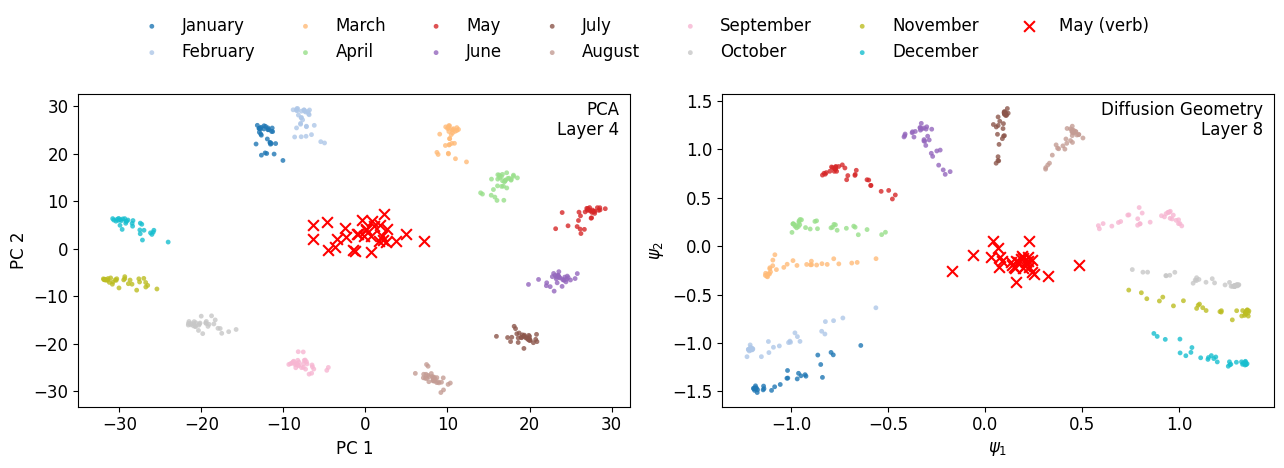 PCA nicely reproduces the circular structure at layer 4 and also separates the May-verb tokens successfully. A similar structure is found by diffusion geometry, albeit at later layers and with less symmetry. This is expected, since the month representations sit in the regime where PCA is theoretically optimal: the co-occurrence statistics have translation symmetry, the PMI matrix is circulant, and PCA recovers the exact Fourier eigenvectors. With diffusion geometry, the adaptive bandwidth responds to density variations in the data, which PCA’s rigid Fourier structure smooths over.