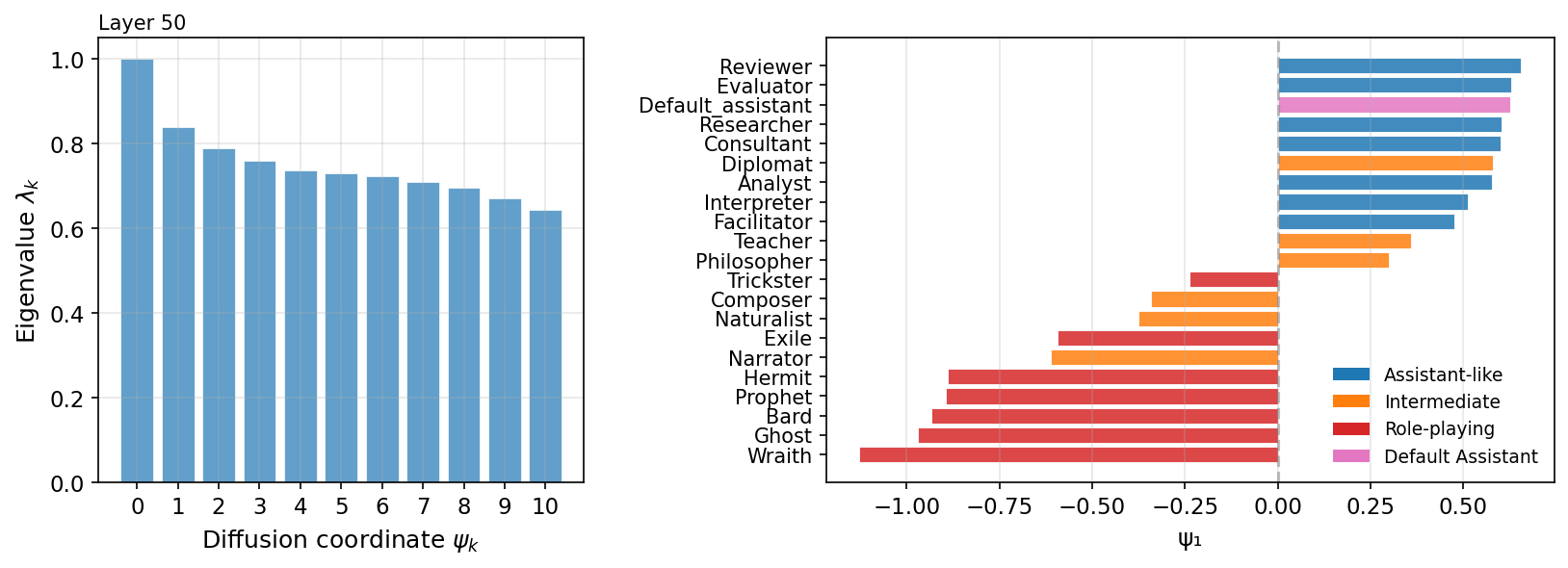 I applied diffusion geometry on the same activations. Looking at the eigenvalue spectrum, we find the first non-trivial eigenvalue as \(\lambda_1\approx0.83\). The relaxation time of this mode is thus \(\tau \approx (1-\lambda_1)^{-1}\approx 6\), so it takes around 6 random walk steps to mix across the dominant geometric partition of the manifold. Here specifically, this partition is exactly the persona axis, so a random walker takes ~6 hops to go from the assistant-like region to the role-playing region. The bar chart on the right shows the role-separation along this diffusion axis \(\psi_1\), which is quite similar to the PCA results from above. The otherwise slow decay of the eigenvalue spectrum indicates that many eigenfunctions carry significant weight for the geometry, implying that the persona manifold is multi-dimensional rather than a single axis.