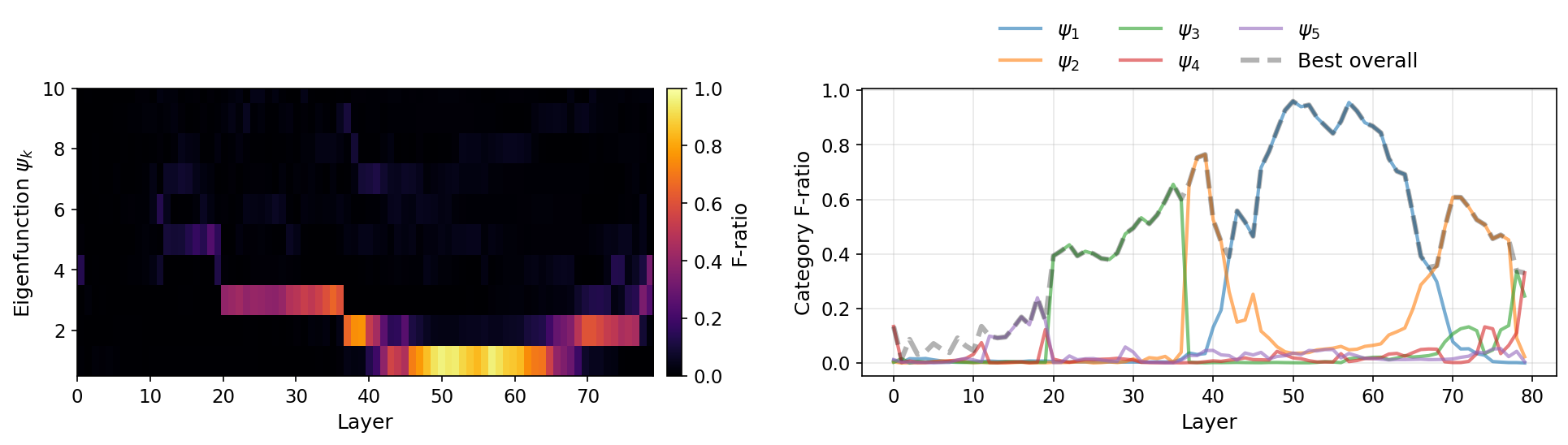 We can again use the F-ratio to study the role separation in more detail. The heat map below shows which eigenfunctions show the strongest separation across the layers, and the results are quite interesting. The persona signal is not uniformly distributed, but concentrates in specific bands along a certain trajectory. The first major peak occurs in \(\psi_3\) around layers 20-40, before briefly \(\psi_2\) and then \(\psi_1\) take over as the dominant persona eigenfunction from layers 40 to 60. Geometrically, this implies an evolution from a small to a large scale geometric feature and backwards.