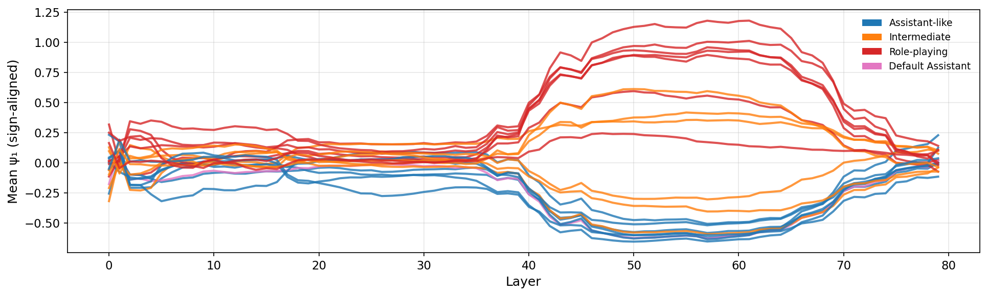 Once the separation sets in, role-playing personas move to one pole of \(\psi_1\), while assistant-like roles move to the opposite pole. The intermediate roles settle between the two groups, closer to the assistant-like side. This separation is maintained approximately across layers 45-65. In the final layers, the signal collapses as all categories converge back toward zero, suggesting the model transitions from encoding “who is speaking” toward next-token prediction, consuming the persona signal in the process.
