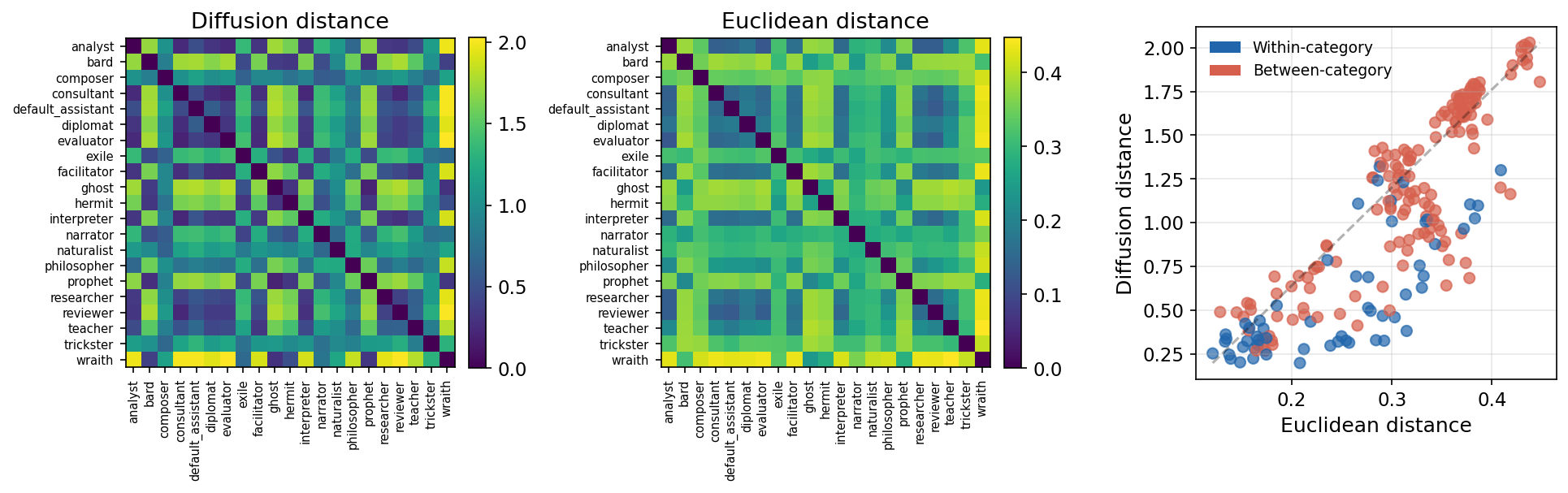 To finally probe whether the persona manifold is genuinely curved, I compared pairwise distances between role centroids as measured in ambient Euclidean space and in diffusion space. On a flat manifold, these two notions of distance would be proportional. Instead, we find a systematic discrepancy. At similar Euclidean distances, within-category pairs (blue) have systematically lower diffusion distances than between-category pairs (red). For example, many role pairs sit around 0.25-0.35 in Euclidean distance, but their diffusion distances range from 0.3 to over 1.5 depending on whether they share a category. Two roles can be equally far apart in Euclidean space, yet the random walk traverses easily between them if they share a category and struggles if they do not. Diffusion geometry captures this distinction because it measures distance along the manifold rather than through ambient space, detecting the branching structure that separates persona categories. The diffusion distance heatmap reflects this: it shows sharper block structure than its Euclidean counterpart, with tighter within-category blocks and a clearer contrast between the assistant-like and role-playing groups.