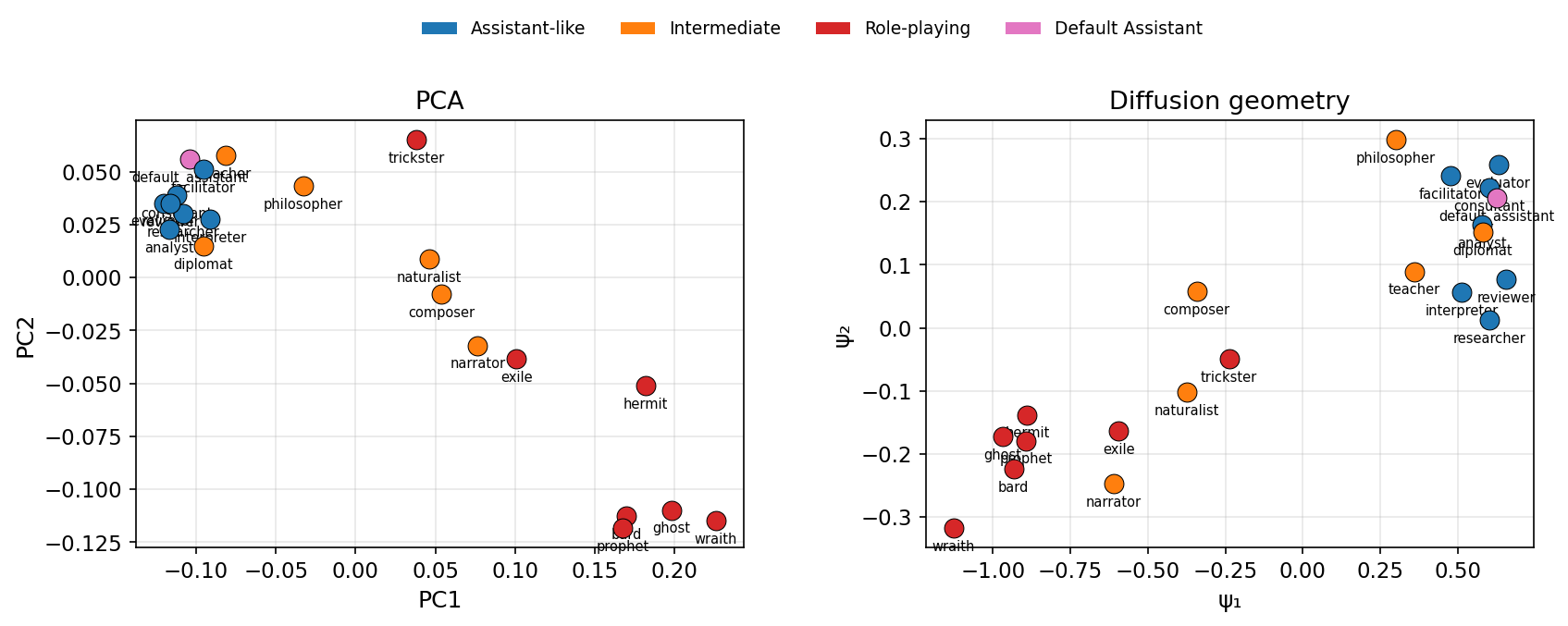 In diffusion geometry, \(\psi_1\) captures a similar separation to the assistant axis, but \(\psi_2\) appears to reveal more within-category structure. The assistant-like roles, which PCA compresses into a narrow range, spread more visibly along \(\psi_2\): evaluator and facilitator sit near the top, while researcher and interpreter sit near the bottom. Among the role-playing roles, wraith and bard occupy one extreme while trickster sits at the other. The intermediate roles spread across the full range of \(\psi_2\), with narrator sitting closer to bard than to teacher, and philosopher closer to evaluator than to hermit. PCA’s second component shows some of this spread as well, but with less separation, particularly among the assistant-like roles.