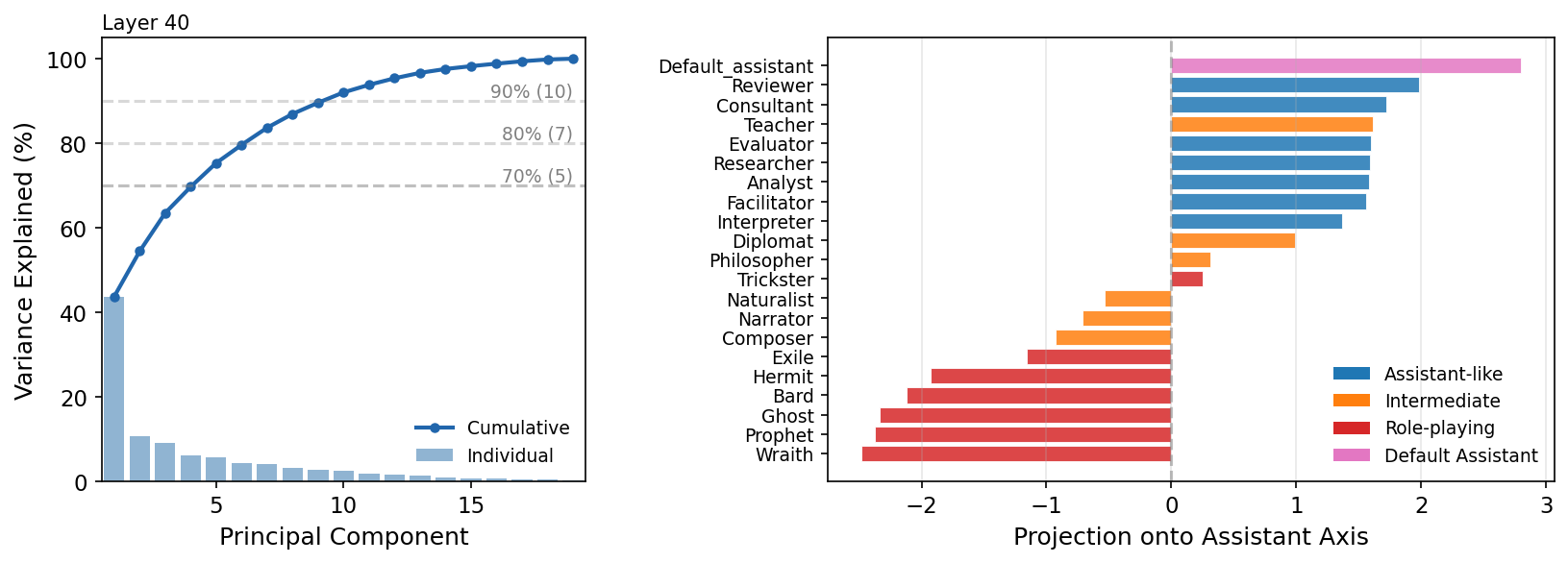 I first wanted to see whether I can reproduce the results using PCA on the role vectors, getting the assistant axis by assistant_axis = default_axis - mean(all_roles). We probe in the middle layer 40, and find that PC1 alone captures more than 40% of the variance. As the right plot shows, we get quite a clean separation between assistant-like and role-playing roles, with some minor permutations between the role categories. This confirms the setup and serves as a baseline.