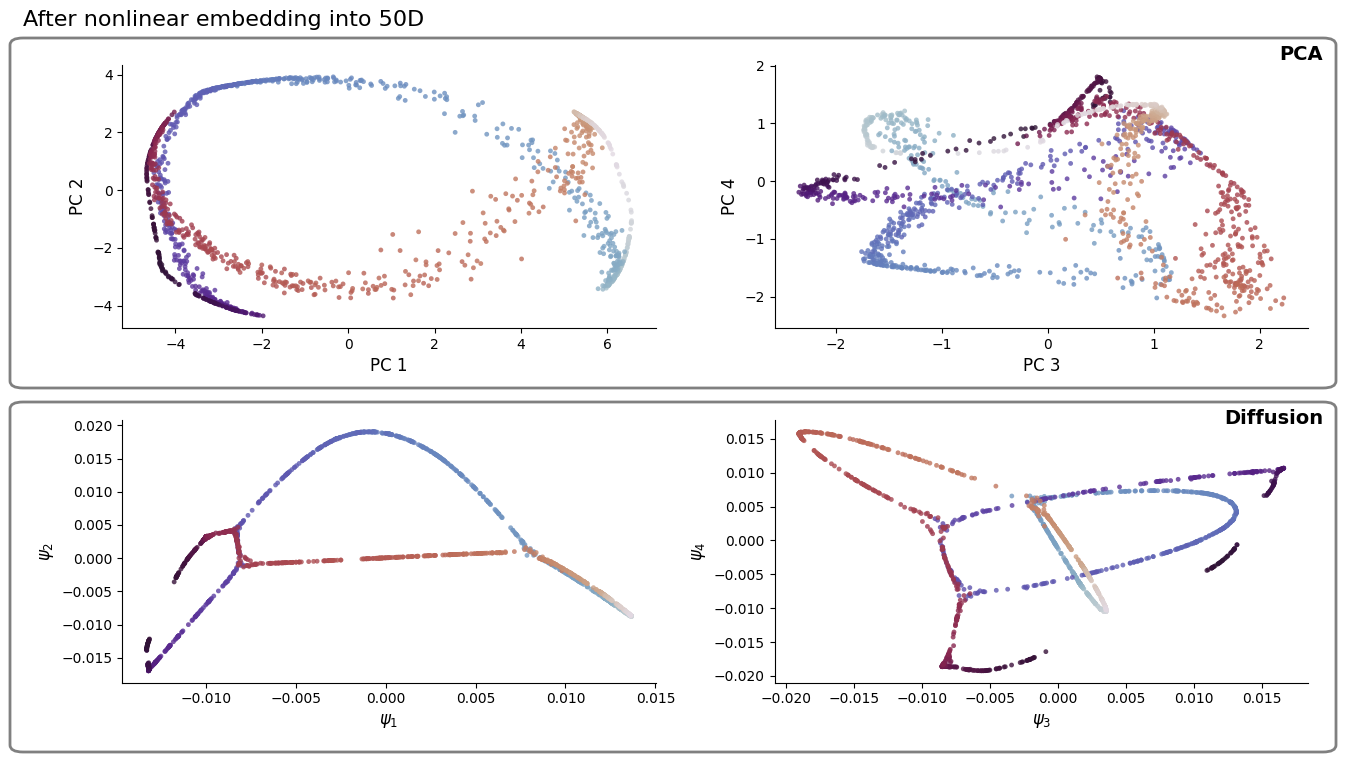 If we embed the dataset from above non-linearly into 50 dimensions, we can compare how PCA and diffusion geometry recover the geometry. PCA finds the directions of greatest variance. It preserves some coarse shape, but regions that are far apart along the actual manifold collapse onto the same region in the projection. PC3 and PC4 scramble the structure further. Diffusion geometry, on the other hand, builds its coordinates from the connectivity of the data itself. Note how the colors progress smoothly on the reduced representation, meaning it conserves the global structure of the original manifold. The double-loop structure of the \(\psi_3/\psi_4\) panel corresponds to the second harmonic.