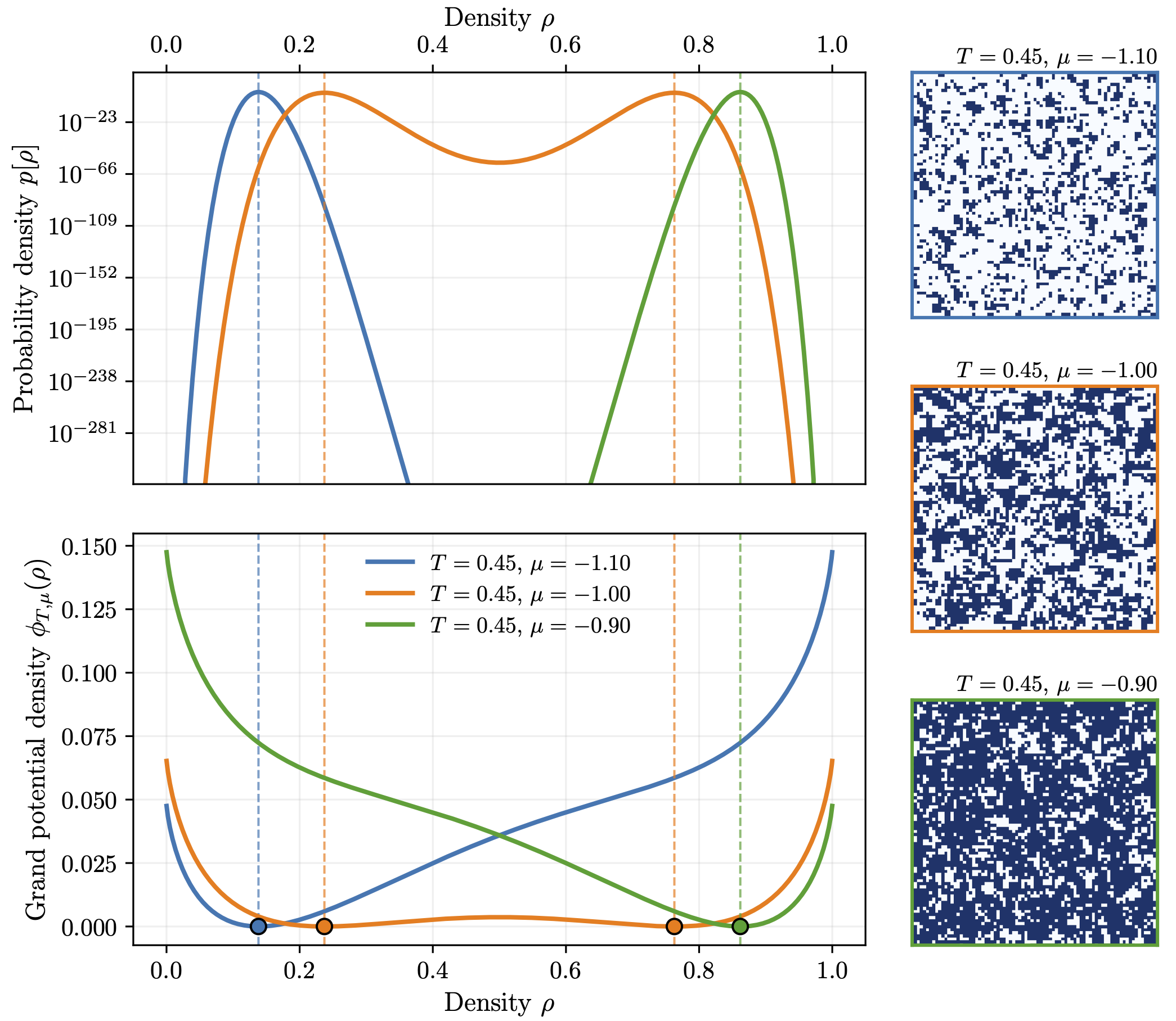 \[\mathbb{P}[\rho] \propto \exp\left(V \left[ \frac{J\rho^2 + \mu\rho}{T} - \left( \rho \ln \rho + (1-\rho)\ln(1-\rho) \right) \right] \right).\]For large systems (\(V \gg 1\)), this distribution peaks sharply at the density that minimizes the grand potential density: